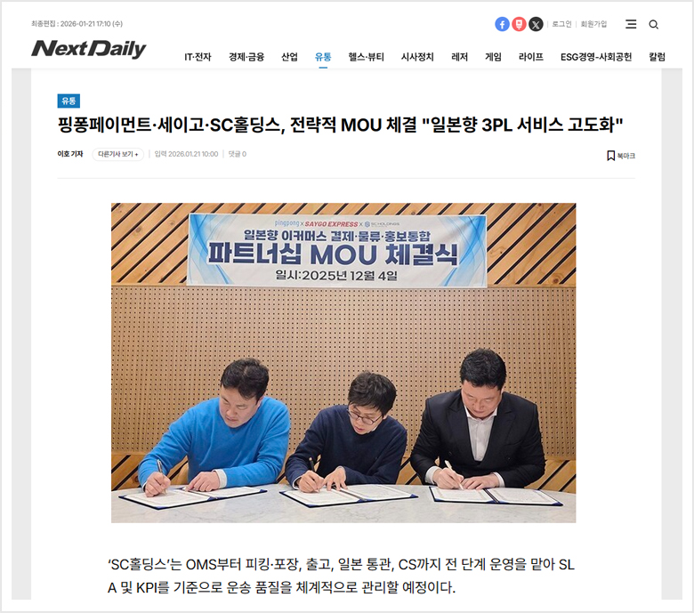 [ 넥스트데일리 ] 핑퐁페이먼트·세이고·SC홀딩스, 전략적 MOU 체결 "일본향 3PL 서비스 고도화"