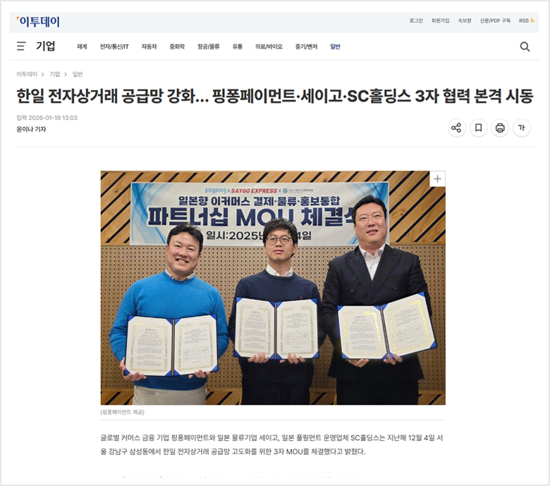 [ 이투데이 ] 한일 전자상거래 공급망 강화… 핑퐁페이먼트·세이고·SC홀딩스 3자 협력 본격 시동