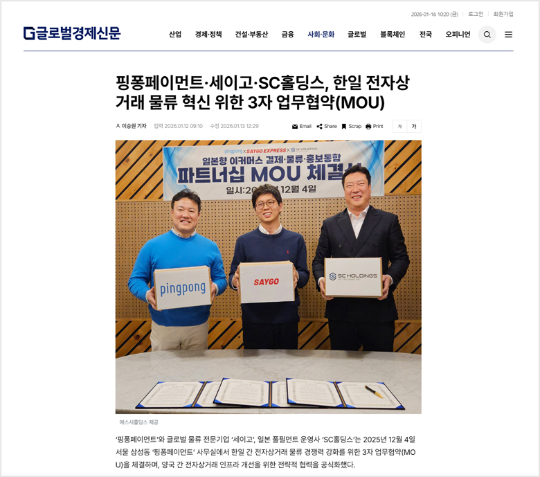 [ 글로벌경제신문 ] 핑퐁페이먼트·세이고·SC홀딩스, 한일 전자상거래 물류 혁신 위한 3자 업무협약(MOU)